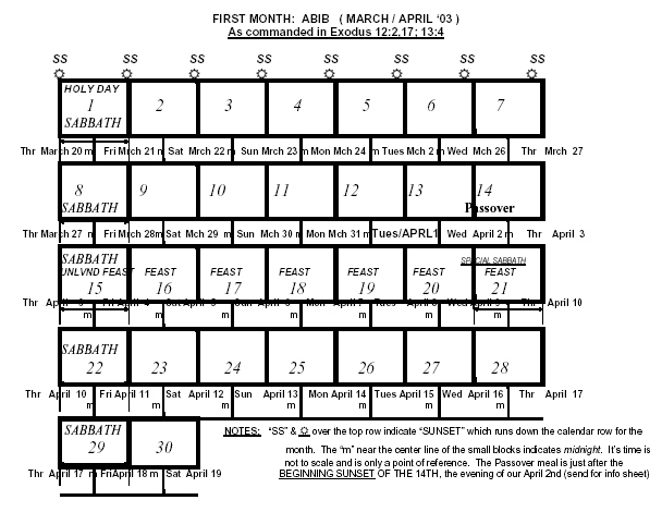 Q. Your calendar starts out the year with the first day (Abib 1) as a Sabbath. How can this be correct when the fourth commandment (Ex.20:8-10) tells us that the seventh day is the Sabbath? Why is Abib 1 and 8 a Sabbath instead of Abib 7? A. This is covered on the second side of tape three of the cassette lessons. Please review the tape again in addition to reading this answer. The law of Yahweh concerning our work/rest schedule for a given seven day period is that we work for six days and rest on the seventh. Exodus 20:8-10 does not say "the seventh day of month one is to be a Sabbath". If that was the commandment, Yahweh would have been specific and declared it so. The commandment is to work six days then take a rest. But which day the "one in seven Sabbath" is , is not dealt with by the fourth commandment. In the whole scope of the existence of our universe, we realize that it was a creative work on the part of Yahweh Almighty. But before He began to work on His creation, from the viewpoint of our finite minds, Yahweh was symbolically "at rest", in that whatever He was "doing", it wasn't creating the universe. Therefore a calendar which points this out and records a "day of comparative rest" before the initial six days of work, would actually be correct as opposed to one which shows the first day as a work day. However beyond even this observation, we know from Scripture that the faithful patriarchs of our Hebraic family held Abib 1 as a Sabbath. Remember, as explained in the tape lessons, Yahweh's calendar is primarily a double or "repeated" calendar in that the second half of the year is a repeat of the first half. This is so we may know it is established by Yahweh. His truths are always confirmed by a double witness. "And that He would shew thee the secrets of wisdom, that they are double to that which is!" (Job 11:6) "And for that the dream was doubled unto Pharaoh twice; it is because the thing is established by God ...." (Gen.41:32) In fact, the Hebrew word for YEAR comes from the word Shaw-naw (Strong's # 8138) and it means "the doubling". Keeping this in mind, we see that the first day of the second half of the year (Feast of trumpets) is mandated to be a regular Sabbath forbidding servile work. (Num.29:1; also Lev. 23:24,25) Therefore it can only fit within the divine context of the meaning of YEAR (Shaw-naw/double) if the first day of the first half of the year, namely Abib 1, will likewise be a Sabbath from servile work as well. And even though our corrupted King James Version Bibles do not state that Abib 1 is a Sabbath when read in the English, ... if we examine the events pertaining to Abib 1 from the Hebrew text, we see that, indeed, it was and is a Sabbath. Although the Sabbath requires a rest from servile work (occupational, community, or house work), much work in the ministerial deeds of the temple was done on these "weekly" Sabbaths. Cleaning of the temple and organizing for the convocation meeting of the whole congregation of Israel was part of the worship procedure on the Sabbath. This is what is meant by "hallowing" the Sabbath as directed in the fourth commandment, "wherefore Yahweh blessed the Sabbath day, and HALLOWED it." (Ex. 20:11) Hallowed is the same Hebrew word as SANCTIFY (Kaw-dash: to make ceremonially clean. Strong's # 6942) When the Sabbath is hallowed/sanctified it is prepared by cleaning and preparing the place of worship of the congregation. This effort honors the Sabbath. When King Hezekiah restored the true worship of Yahweh to Israel in 741 B.C., he began by initiating the hallow of Abib 1 according to the directive of Exodus 20:11. "And the priests went into the inner part of the house of Yahweh, to cleanse it .. and they began on the first day of the first month (Abib) to sanctify (kaw-dash/hallow, same word as in Ex.20:11 applied "to hallow" the Sabbath) II Chron.29:16,17. With the hallow of Abib 1, Hezekiah restored the Mosaic law that we are to hallow the Sabbath, the ceremonial day for the congregation to gather together and praise Yahweh as one people. Note that they also gathered on the eighth day of Abib for a convocation (v.17). 750 years earlier Yahweh had commanded Moses to hallow/sanctify Abib 1 as the first congregational meeting day of the year set aside for worship. "And Yahweh spake to Moses, saying, On the first day of the first month shalt thou set up the tabernacle of the tent of the congregation" (Ex.40:1,2.) Additionally, we see that this was a yearly commandment to be followed by Moses. "And it came to pass in the first month in the SECOND year, ON THE FIRST DAY OF THE MONTH, that the tabernacle was reared up." (Ex.40:17) The Scriptures reveal that these set aside days of Holy Convocations took place on the Sabbath when no servile work was done. "And in the fourteenth day of the first month (Abib) is the Passover (not a Sabbath, ed.) of Yahweh. And in the fifteenth day of this month is the feast: seven days shall unleavened bread be eaten. In the first day (15th) shall be an holy convocation; ye shall do no manner of servile work therein:" (Num.28:17,18) When we examine the whole scope of the convocational Sabbath meeting days of ancient Israel (when they were obeying Yahweh) we see that they were hallowing or sanctifying the 1st, 8th, and 15th of Abib as set aside for "one in seven" for worship of Yahweh. We are specifically told, even in our lacking English versions, that they were honoring Abib 15 as the Sabbath day, doing no servile work. Since the Sabbath on Abib 15 is both preceded and followed by six work days, then Abib 8 and Abib 1 are indeed Sabbaths, which is why Scripture tells us that the priests were busy with sanctifying the temple on these days. Now look at your C.B.M. calendar again and you will see how it all fits together. The Scriptures explain themselves. Abib 1 is always a Sabbath, hallowed , sanctified, and cleansed for the worship of Yahweh by all of Israel.
