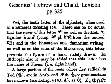 The tenth letter of the Hebrew alphabet spelled in English as "YOD", has the vocal power of our letter "Y". This letter is vocalized as "YAH"(short "a"). This is the Name of the Father. This letter is the form of an authoritative right hand. It is also the most common hand of power. In the long esteemed tradition of our Saxon people, if you raise your right hand up in front of you at a 45 degree angle as if to salute a superior, you will see the rudimentary shape of the letter "Yod". This letter and a reference showing it's origin are pictured below.