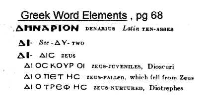 But perhaps the most factual insight relating to this discussion is that there was no Greek god named or pronounced "Zeus" before or during the time the New Testament was written! The Greek god we now call Zeus, during the first century Greek period was spelled and known to the Greeks by their letters "Delta - Iota - Sigma". This "god" was pronounced "DEECE" ..... never ZEUS. If our Savior's name in Greek was copied from the Greek main god, then His named would now be JEDEECE not JESUS . There is no "D"in Jesus' name. There is no DEECE in Jesus' name. Strong's Exhaustive Concordance shows the name Zeus at reference # 2203 and says it is uncertain of the origin of this modern appellation. Strong's does however show under the word "Zeus", the original name of this god correctly as "DEECE" with no spelling similarity to that of Zeus. Those of you who have a Strong's Concordance can check this out for yourselves. An even better reference is from The Greek Word Elements , the Netherlands, 1987, page 68, under the dictionary listings for the letter "D" -- that is "delta" in Greek. Below is an excerpt from the page where the ancient word for "Zeus" is located. It is the word spelled "Delta - Iota - Sigma" DEECE once again by pronunciation, even though it lists the non original English "Zeus" in the definition. This is word reference proof that Zeus never was "Zeus" in Greek.