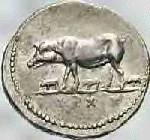In further support of what the above mentioned historians have written, it is interesting to note that the various Roman Legions were given their own distinct coinage for pay in the service. Many of these coins now serve as historical artifacts in documenting the signs of the several legions. Below is a coin of the Tenth Legion in the Judean and neighboring areas during the time of Christ. The boar and the numeral "X" (10) is clearly visible showing which Roman army unit was being depicted.