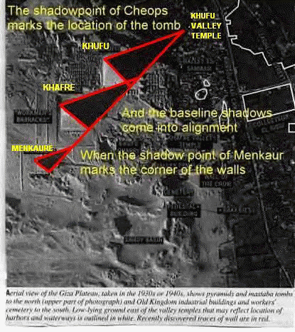 The three combined shadows of the Pyramids Menkaure, Khafre, and Khufu, speak loudly as to the importance of the Winter Solstice as THE momentous event of the year! The agricultural year for the Egyptians started with the overflowing of the Nile River each year as the river deposited black silt in the lowlands fertilizing it for planting crops. This was in early July and the Egyptians tied the annual Nile flooding with the helical rising of the star Sirius. Therefore the agricultural or "civil" year was based on Sirius' rising in the heavens and started in early July. The Egyptian sacred solar year however was based on the gods Osiris, Isis, and Ra along with the story of life, death, and rebirth of these gods whom the Egyptians saw in the sky. The winter solstice on or about December 21,22 was the pivotal point of that story. On the winter solstice each year the Khufu Valley below the Giza Pyramids becomes the "Valley of The Shadow of Death" (The Winter Shadow) as the giant shadow points to that location, and temple services to the Sun gods commemorated this day. The below aerial photo was taken in the 1930's or 40's and appeared in Archeology Magazine along with an article by Dr. Zahi Hawass, premier Egyptologist and lecturer on ancient Egypt. [ Dr. Hawass web site: http://guardians.net/hawass/ ] It is not known who the pilot or photographer was but they obviously were airborne to specifically track the shadow phenomenon of the winter solstice. The view is directly above, and the sun is at its lowest point on the southwest horizon.