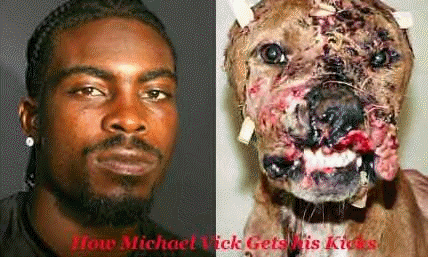 It is obvious to many people's reasonable opinion that the only reason Michael Vick, Philadelphia Eagle's quarterback, stopped having his kicks by cruelly killing dogs is because he got caught. America has become desensitized to decency, and almost "anything goes" as long as a buck can be made. People actually spend $$ to see this "person" entertain them. Man's best friend can't speak out or stop such behavior. I wonder how Vick would do in a "bare hands/paws" celebrity cage fight against my 150 pound pack dog (and best buddy), with Vick easily outweighing him? Below is an example of what happened to dogs behind closed property in Vick's Virginia mansion dog fighting ring. How soon people forget. - - KL